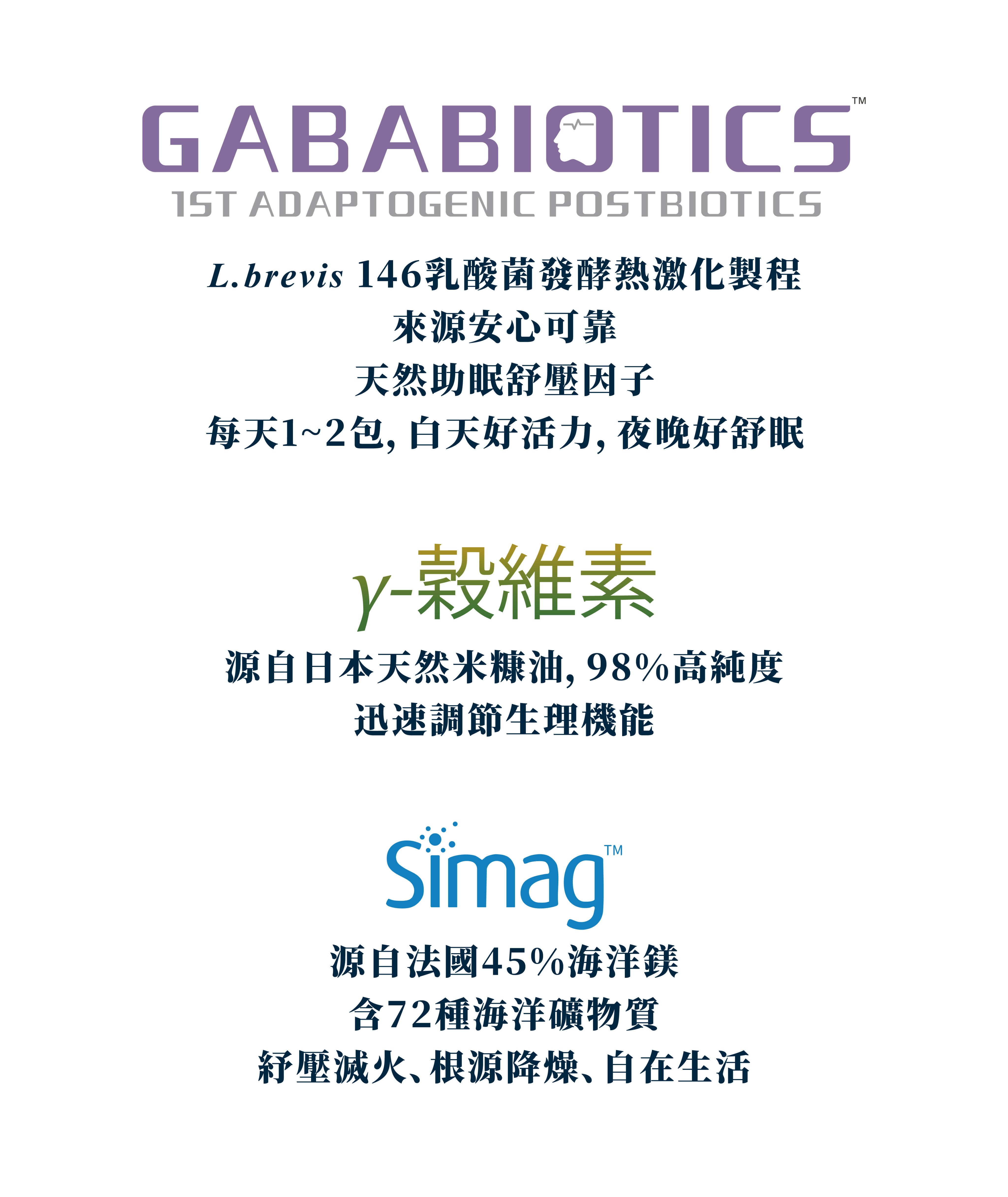 果寡醣粉(非基改玉米澱粉、果寡醣)、麩胺酸發酵物(非基改玉米澱粉、麩胺酸發酵物(含 γ-aminobutyric acid,GABA、乳酸菌(熱去活))、乳酸菌[醱酵乳桿菌(Lactobacillus fermentum LF26)、副乾酪乳桿菌 (Lactobacillus paracasei LPC12)、鼠李糖乳桿菌(Lactobacillus rhamnosus LRH10)、長雙歧桿菌(Bifidobacterium longum BL986)、嗜酸乳桿菌(Lactobacillus acidophilus LA1063)、瑞士乳桿菌(Lactobacillus helveticus LH43)、嗜熱鏈球菌(Streptococcus thermophilus ST30)】、綜合蔬果抽出物(麥芽糊精、鳳梨萃取物、澱粉水解酵素、青木瓜萃取物、地瓜萃取物)、γ-穀維素、海藻糖、海水抽出物(氧化鎂、羧甲基纖維素鈉)、L-色胺酸。